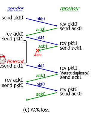 상황2에서는 메시지(=pkt)가 사라졌고 상황3에서는 피드백(=ack)가 사라졌다. 그러나 송신자는 사라진 것이 메시지인지 피드백인지 구분할 길이 없다. 따라서, 이 둘 상황을 구분하지 않고 그냥 재전송할 뿐이다.