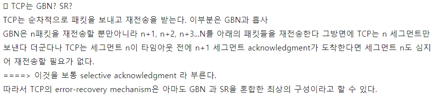 TCP는 그럼 GBN 또는 SR 중 어떤 것을 사용할까? TCP는 사실 GBN과 SR을 혼합하여 사용한다.