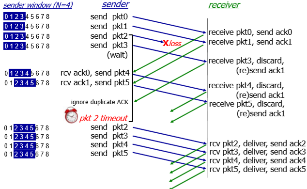 윈도우 크기가 3이다. 송신자는 3개의 메시지를 한번에 전송한다. 그 후 ack를 받고 pkt3을 전송하지만 분실되고 pkt0은 정상적으로 전달된다. 이때 수신자는 pkt0은 그 다음으로 오는 패킷이라는 것을 알고 처리하기 때문에 문제가 없다.