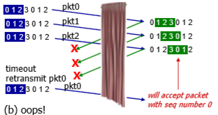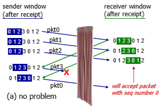 우리가 사용할 수 있는 Sequence 번호는 매~우 한정적이다. 오직 0,1,2,3 밖에 없다고 가정해보자. (Sequence 번호 = pkt#, 즉 pkt 뒤에 붙는 숫자) 이때는 해당 시퀀스 번호를 재활용해야 한다. 실제로 윈도우 크기가 굉장히 클 경우 해당 상황이 발생할 수 있다. (여기서 패킷 0,1,2,3을 보내고 또 다시 전송되는 pkt0은, 이전에 보냈던 pkt0과는 완전 다른 데이터다. 시퀀스 번호가 부족하기 때문에 시퀀스 번호만 중복 사용할 뿐이고 데이터 자체는 같지 않다. 헷갈리지 말자)