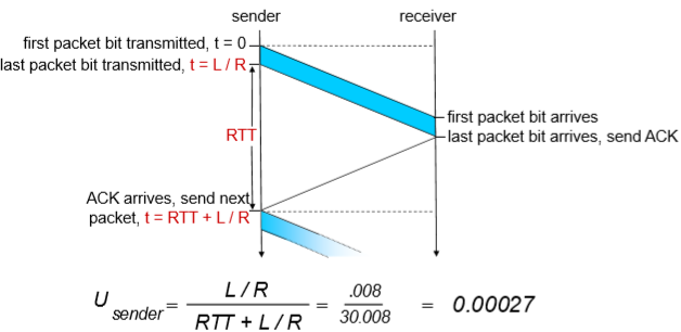 해당 Stop&Wait 은 하나를 보내고 기다리는 방식을 취한다. 이러한 방식은 하나씩 주고받기 때문에 느릴 수 밖에 없다. 따라서 파이프라인을 이용하여 여러 패킷을 한번에 보내고 기다리는 방식을 취한다. 이때 한번에 보낼 수 있는 패킷의 개수가 앞에서 배웠던 Window 크기가 된다. 파이프라인을 통해 성능이 개선될 수 있다. 다음은 성능 계산법이다.