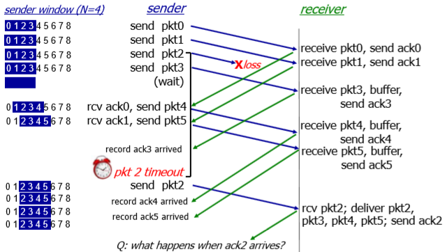 pkt2에 대한 ack2가 안와 timeout이 발생했다. 따라서 송신자는 pkt2를 재전송한다. 수신자는 pkt2를 받은 후, 버퍼에 있었던 pkt3, pkt4, pkt5를 꺼내서 추가적으로 처리하고 ack2를 전송한다. 송신자는 그 다음 패킷인 pkt 6을 보낸다.